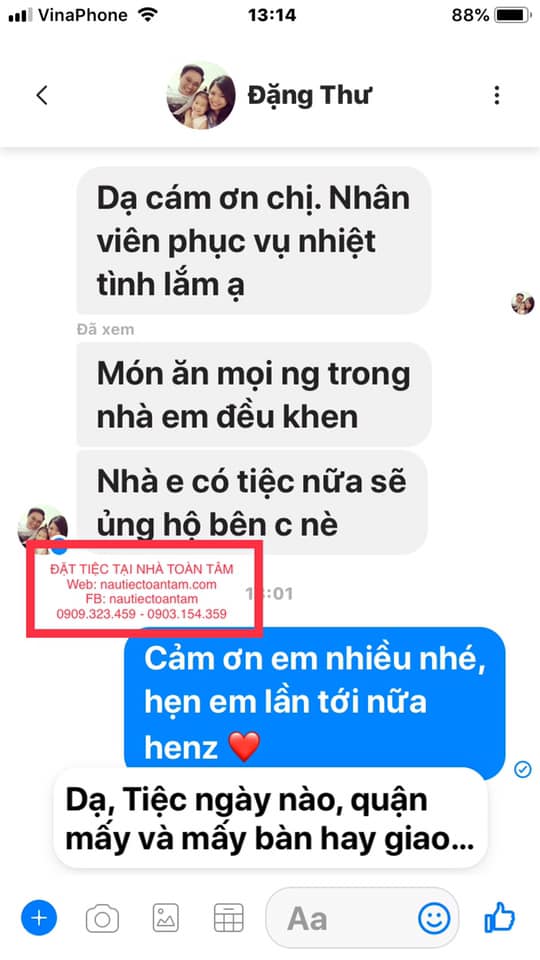 Cảm ơn em Thư đã đặt tiệc tại nhà, quận Bình Thạnh, đường Bùi Đình Túy và những lời nhắn yêu thương đến với đội ngũ Toàn Tâm. Thực đơn tiệc :